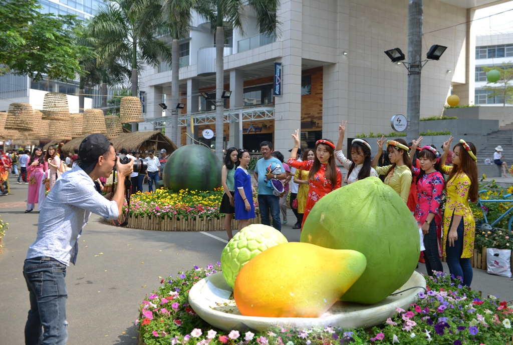 Hình ảnh quen thuộc mâm ngũ quả ngày Tết cũng được tái hiện tại Hội chợ hoa xuân Phú Mỹ Hưng 2017, như một cách nhắc nhớ khách du xuân về những nét văn hóa truyền thống của dân tộc.
