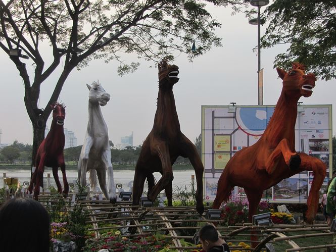 Biểu tượng con ngựa của năm Giáp Ngọ cũng được thiết kế, trang hoàng lộng lẫy và mạnh mẽ tại cổng vào, các tiểu cảnh như lời chúc Mã đáo thành công dành cho khách du xuân.