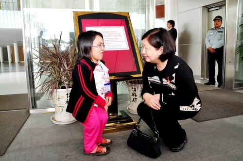 Bà Ting Fei Tsong Ching – Chủ tịch Ủy ban Điều hành Quỹ hỗ trợ cộng đồng Lawrence S.Ting trò chuyện động viên em Đinh Thị Lý, sinh viên Trường Khoa học tự nhiện TP Hồ Chí Minh